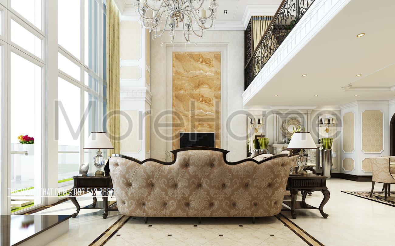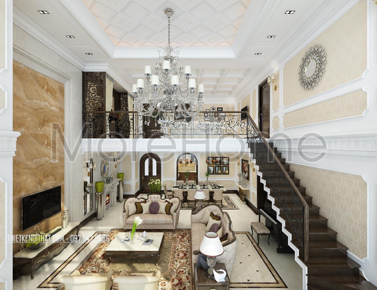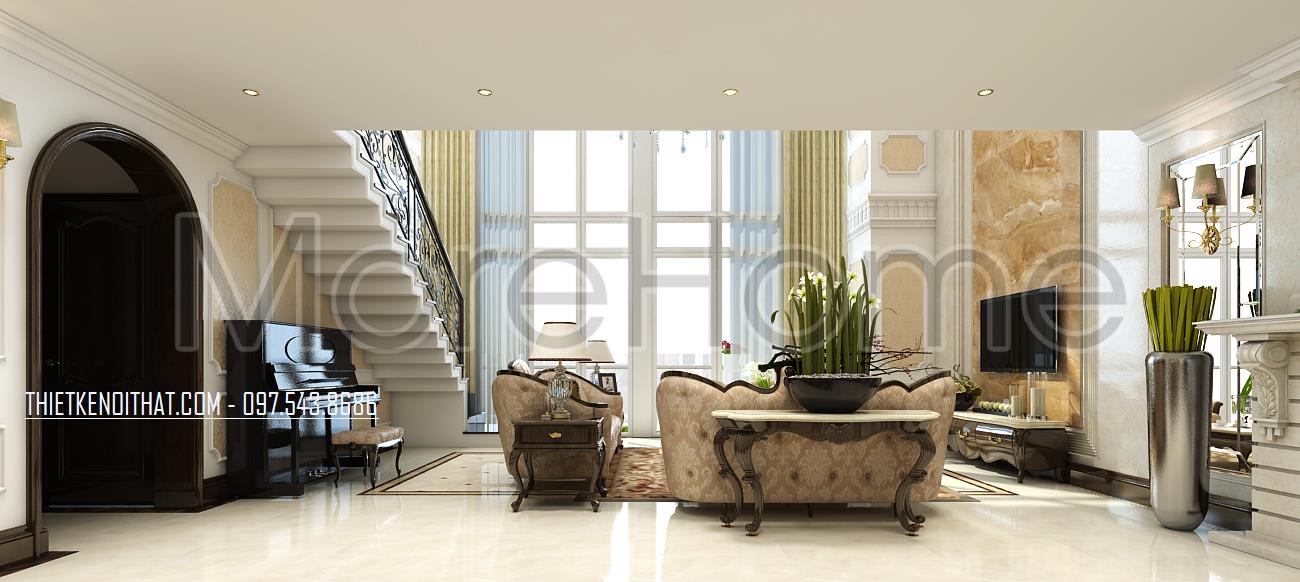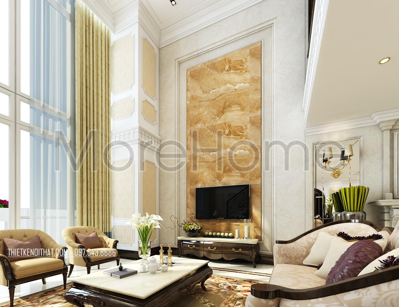 Thiết kế phòng khách tân cổ điển đem đến cho ta một cảm giác ấm cúng và dễ chịu. Với phòng khách này học tiết được chú trọng nhiều hơn đường nét chấm phá tinh tế pha nét cổ xưa xóa tan sự đơn điệu cho không gian rộng. Phòng thiết kế theo hướng mở, vì là căn hộ nằm trên cao nên việc tận dụng để đưa anh sáng và gió mát vào trong căn phòng quả là một điều vô cùng tuyệt vời. Trong thiết kế căn hộ này là mẫu căn hộ hai tầng nên trần nhà cao tạo cho ta cảm giác hơi trống và không được tự nhiên, để khắc phục điểm này Kiến trúc sư More Home đã thiết kế trần cách tân, các ô vuộng được sử dụng để tạo điểm nhấn thay thế cho thiết kế tường sơn đơn sắc thông thường.