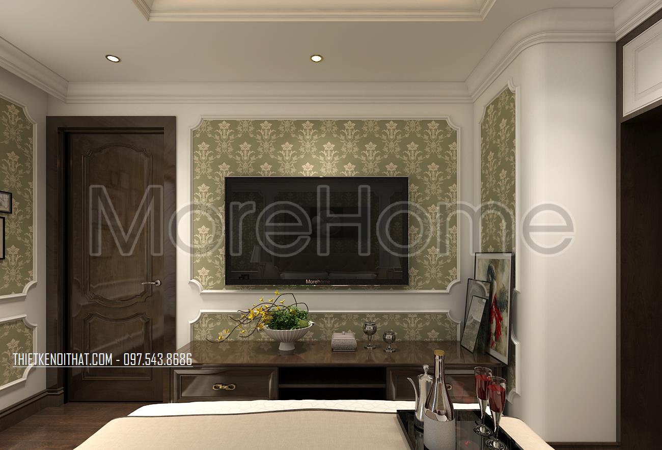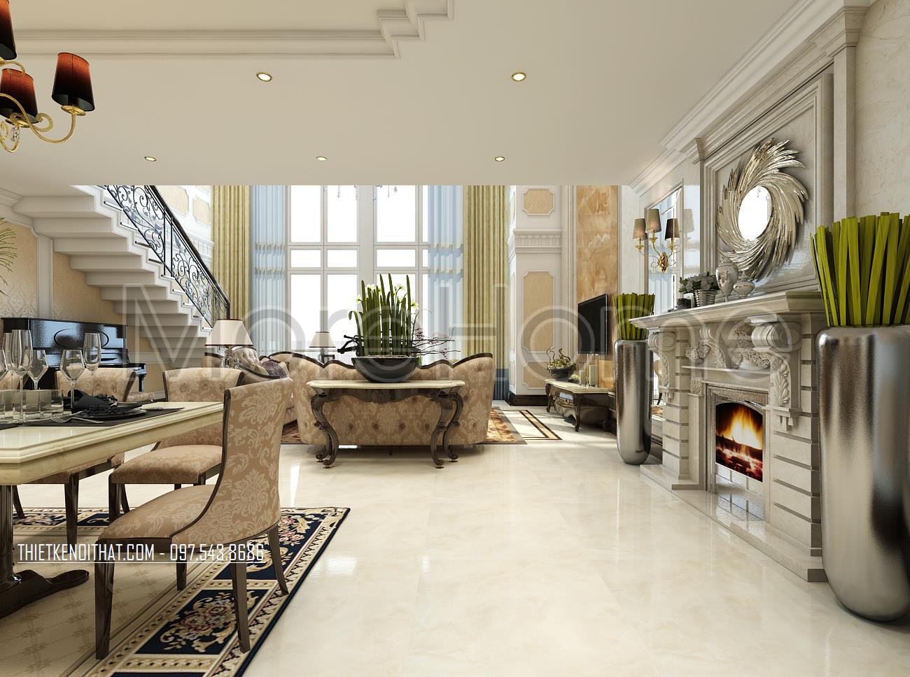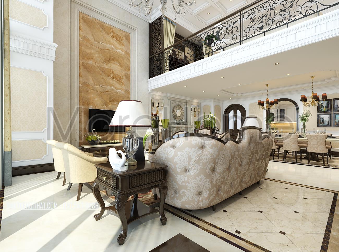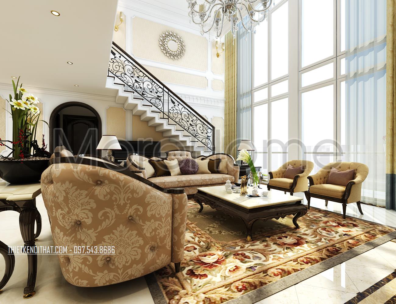 Thiết kế phòng khách tân cổ điển đem đến cho ta một cảm giác ấm cúng và dễ chịu. Với phòng khách này học tiết được chú trọng nhiều hơn đường nét chấm phá tinh tế pha nét cổ xưa xóa tan sự đơn điệu cho không gian rộng. Phòng thiết kế theo hướng mở, vì là căn hộ nằm trên cao nên việc tận dụng để đưa anh sáng và gió mát vào trong căn phòng quả là một điều vô cùng tuyệt vời. Trong thiết kế căn hộ này là mẫu căn hộ hai tầng nên trần nhà cao tạo cho ta cảm giác hơi trống và không được tự nhiên, để khắc phục điểm này Kiến trúc sư More Home đã thiết kế trần cách tân, các ô vuộng được sử dụng để tạo điểm nhấn thay thế cho thiết kế tường sơn đơn sắc thông thường.