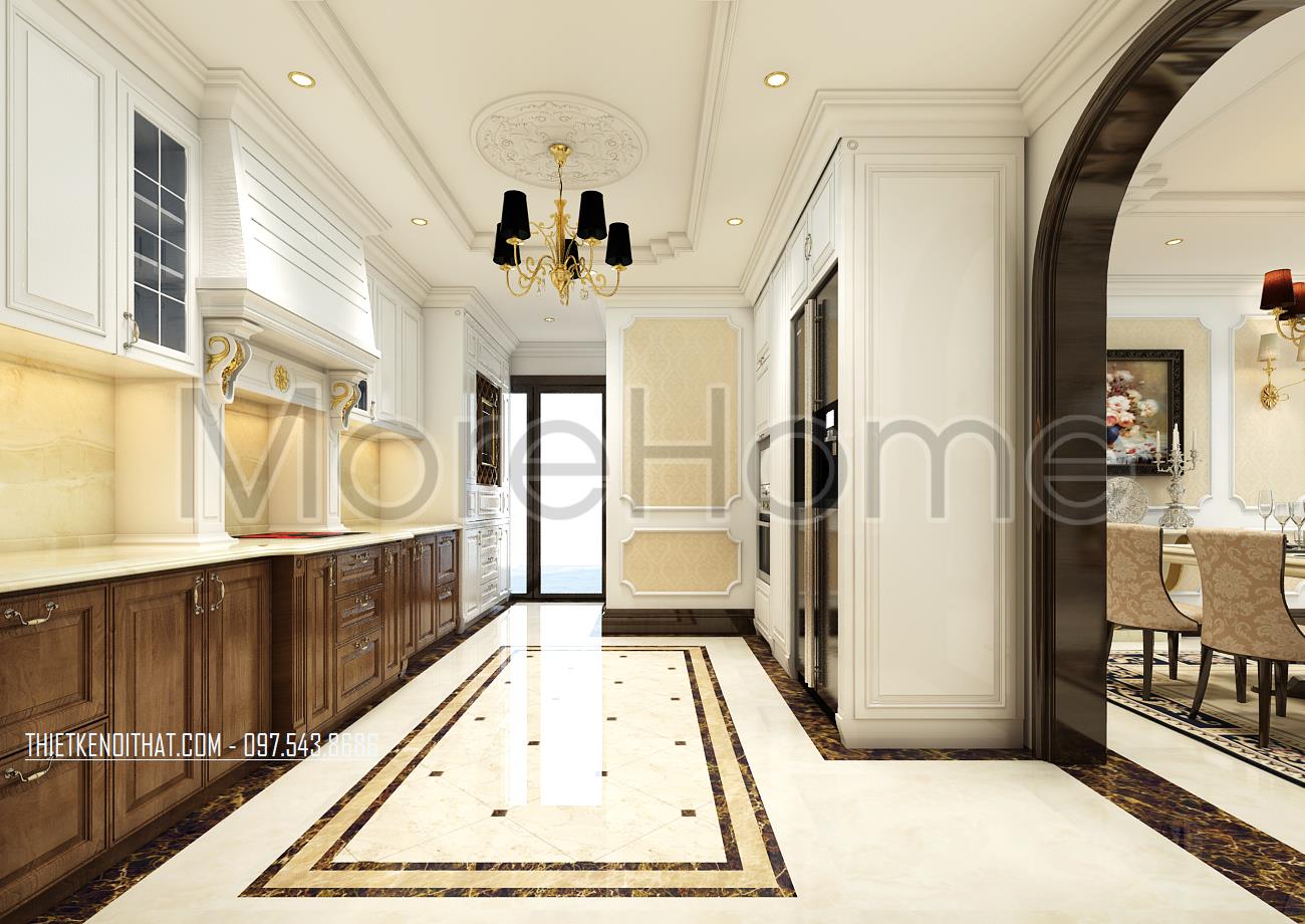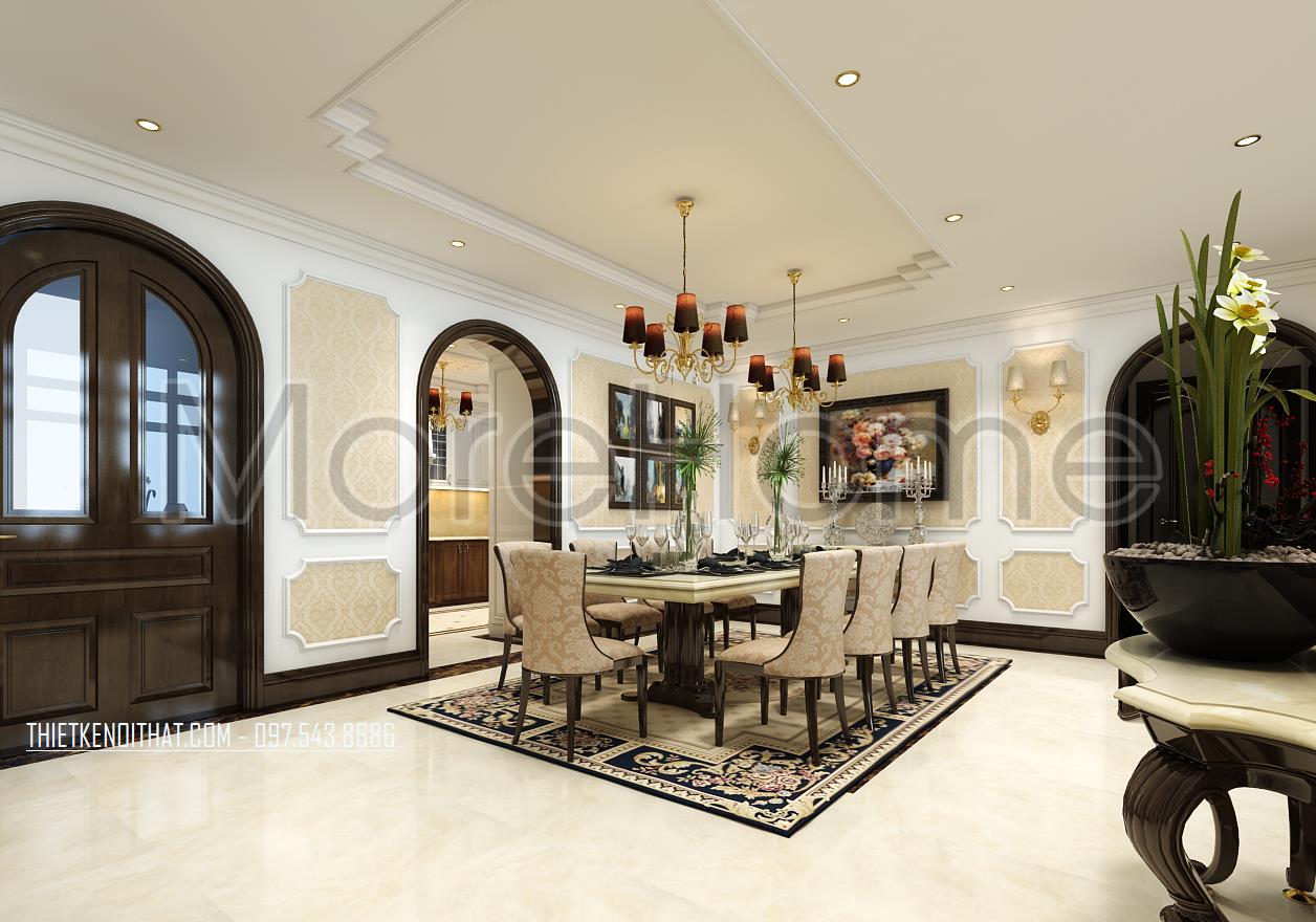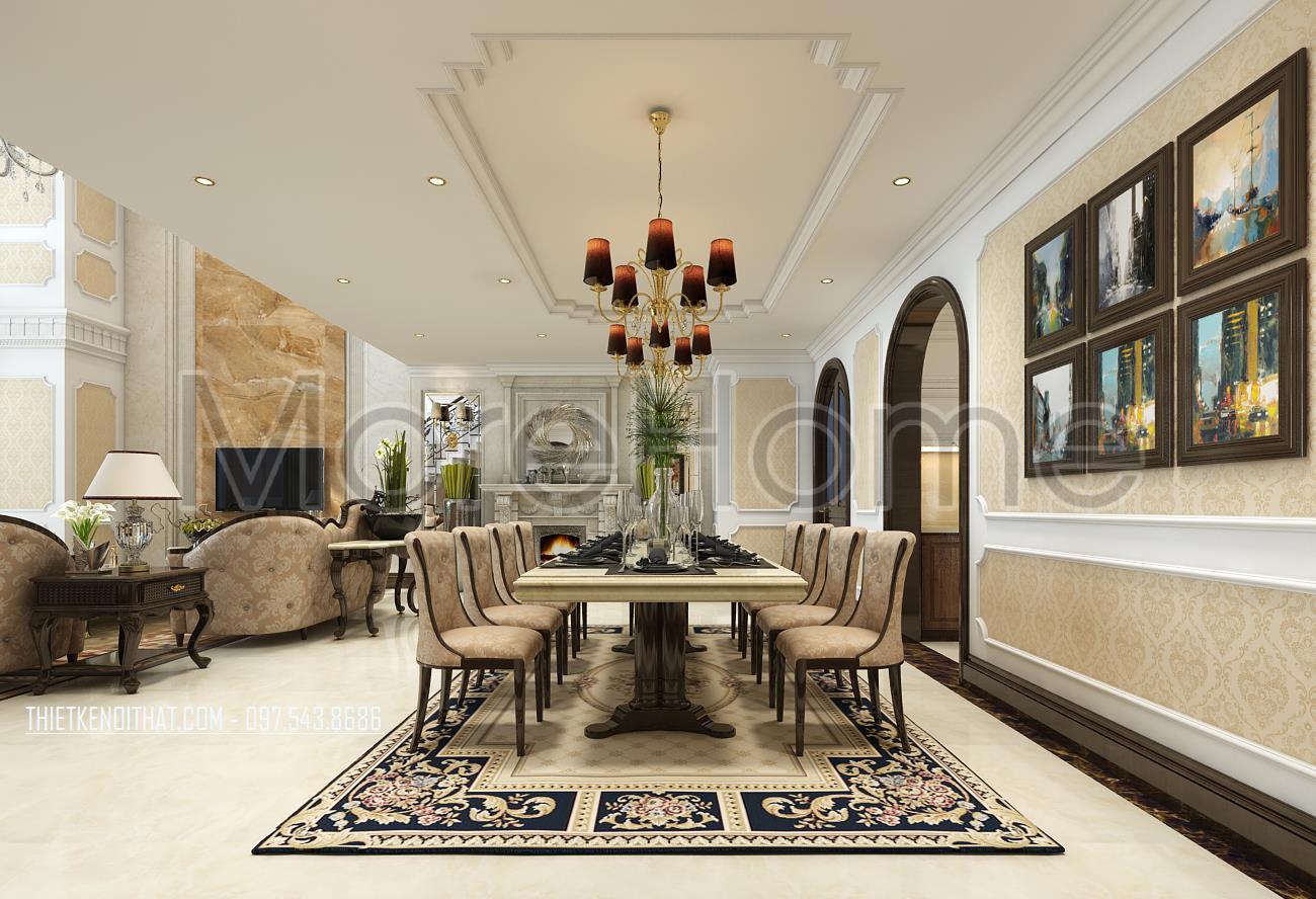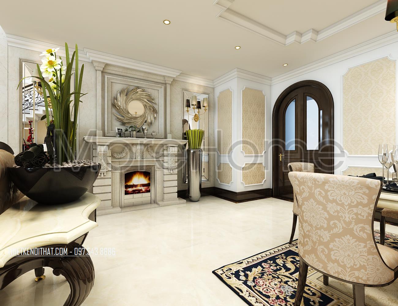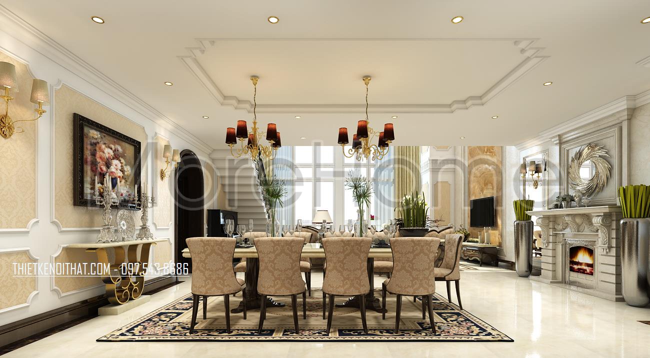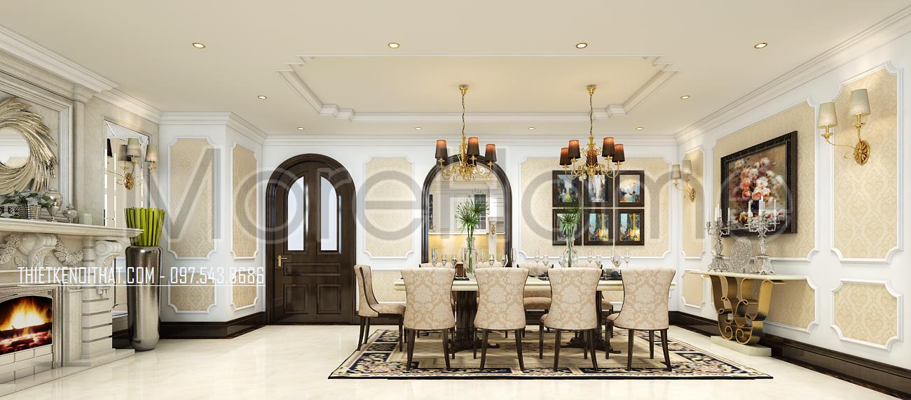 Tiếp đến là nội thất phòng ăn sang trọng. Một chiếc bàn ăn to rộng với các đường nét trang trí nhẹ nhàng trên tone màu vàng kim mang lại cảm giác tinh tế và tỉ mỉ. Một trong các xu hướng thiết kế trong năm 2016 được đề cấp trên trang web Freshome chính là thiết kế sử dụng kim loại hay các màu sắc ánh kim loại để tạo điểm nhấn và mang lại sự mới lạ cho không gian sống. Vận dụng xu hướng mới trong thiết kế, kiến trúc sư sử dụng gương cách tân làm mới kết hợp với tone màu ánh kim bạc ngay trên thiết kế giả lò sưởi tạo điểm nhấn sáng tạo cho không gian. Thiết kế bếp với chất liệu gỗ tự nhiên, hai tone màu veneer là nâu trầm và trắng đục mang đến sự kết hợp cân bằng cho không gian bếp.