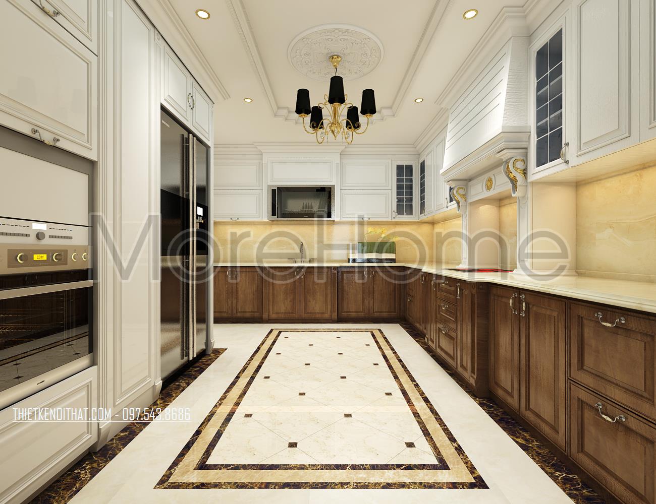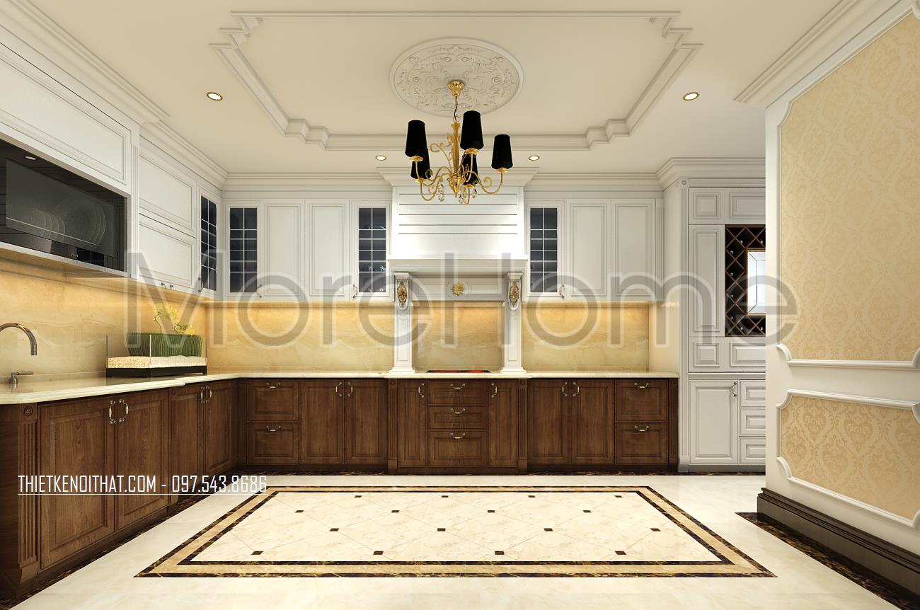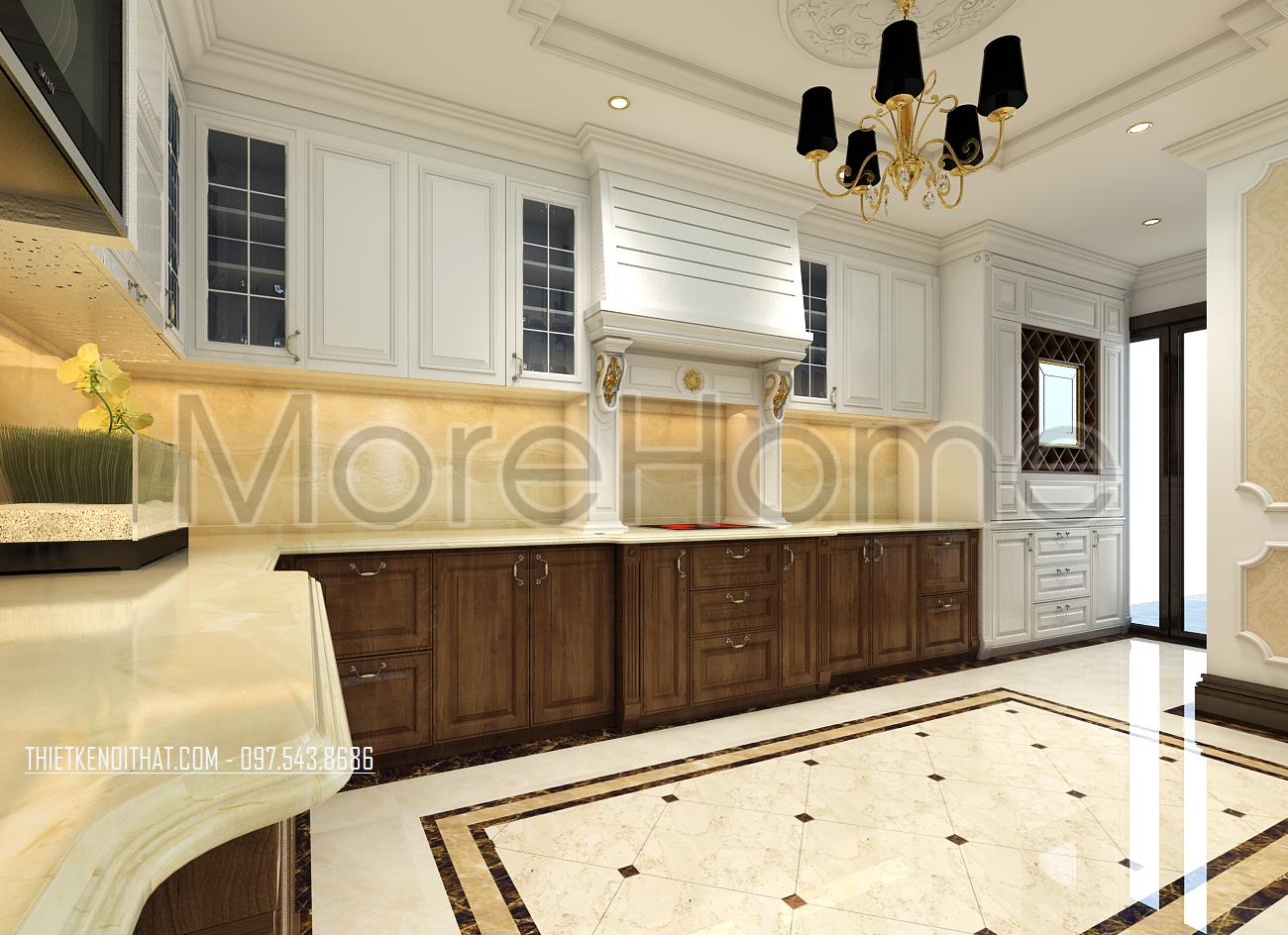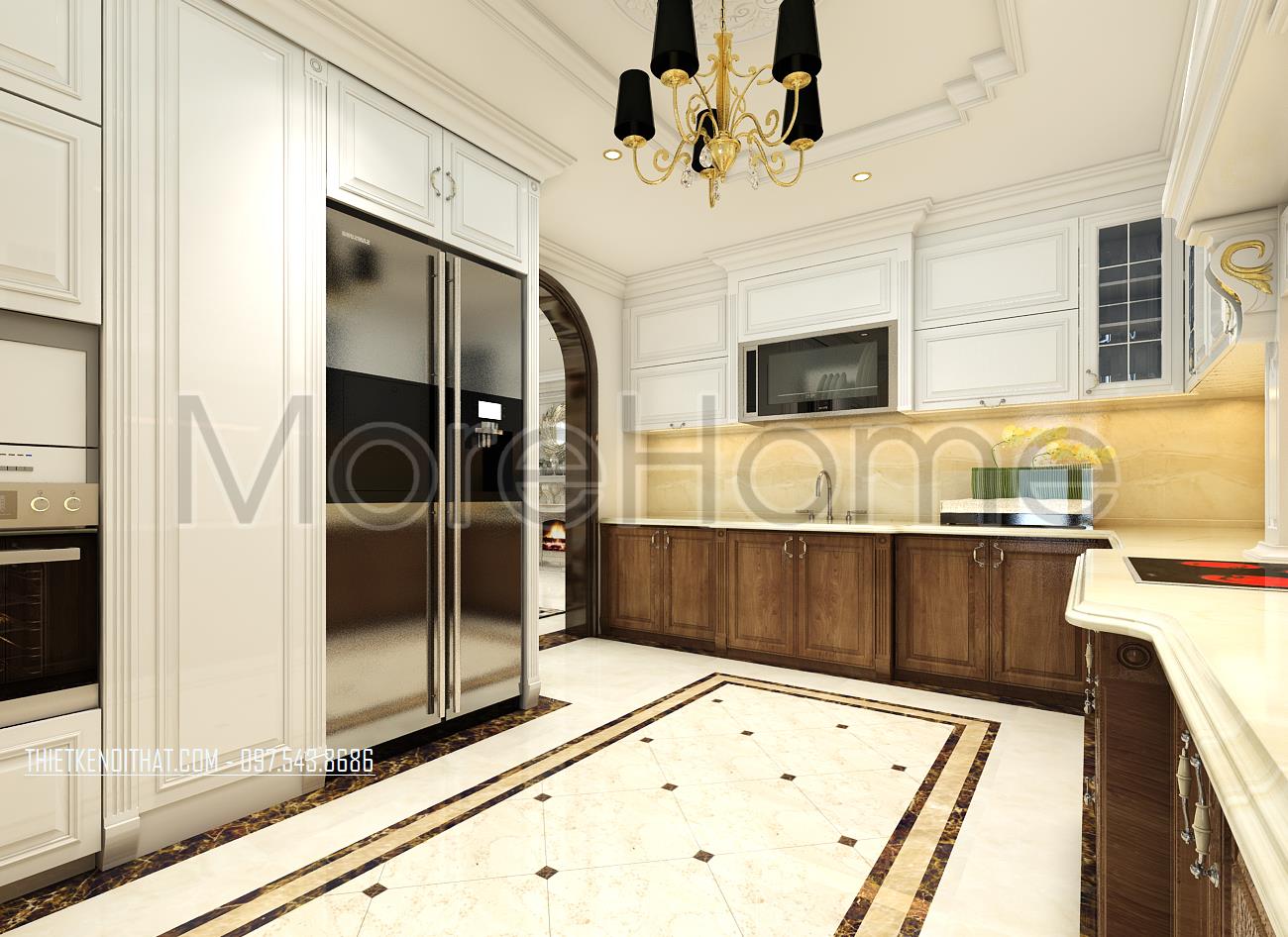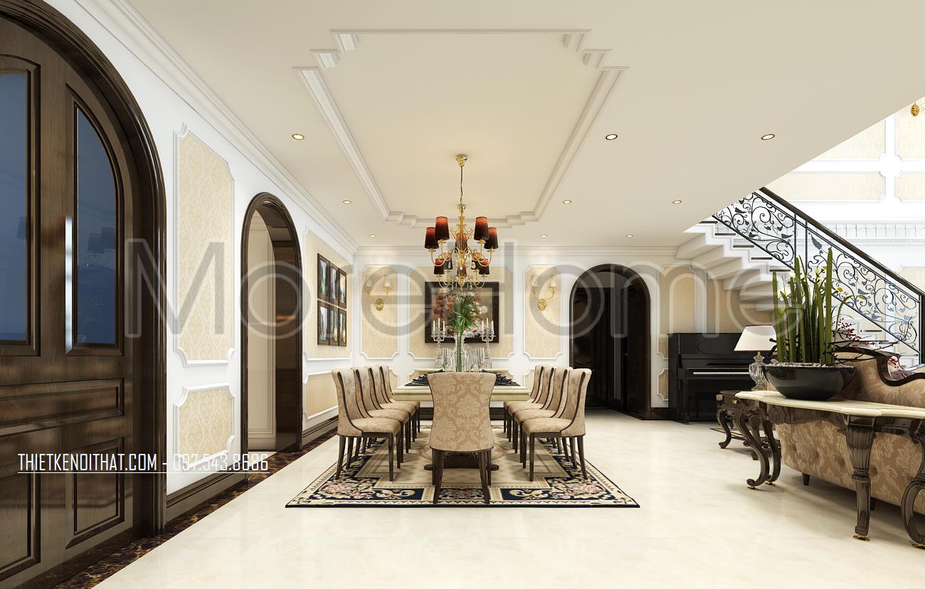 Tiếp đến là nội thất phòng ăn sang trọng. Một chiếc bàn ăn to rộng với các đường nét trang trí nhẹ nhàng trên tone màu vàng kim mang lại cảm giác tinh tế và tỉ mỉ. Một trong các xu hướng thiết kế trong năm 2016 được đề cấp trên trang web Freshome chính là thiết kế sử dụng kim loại hay các màu sắc ánh kim loại để tạo điểm nhấn và mang lại sự mới lạ cho không gian sống. Vận dụng xu hướng mới trong thiết kế, kiến trúc sư sử dụng gương cách tân làm mới kết hợp với tone màu ánh kim bạc ngay trên thiết kế giả lò sưởi tạo điểm nhấn sáng tạo cho không gian. Thiết kế bếp với chất liệu gỗ tự nhiên, hai tone màu veneer là nâu trầm và trắng đục mang đến sự kết hợp cân bằng cho không gian bếp.