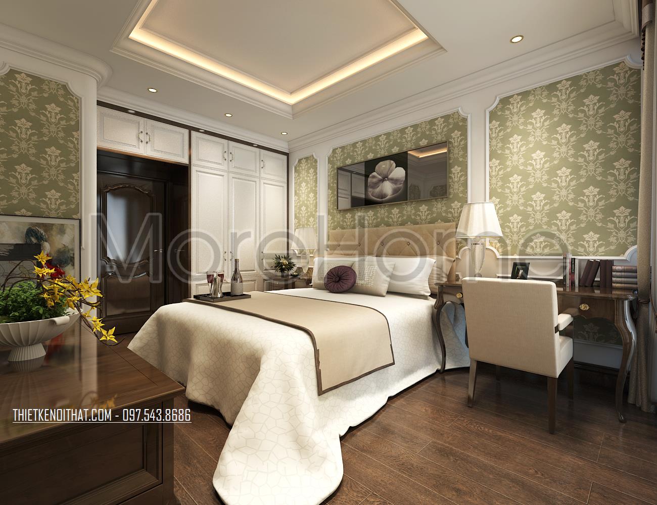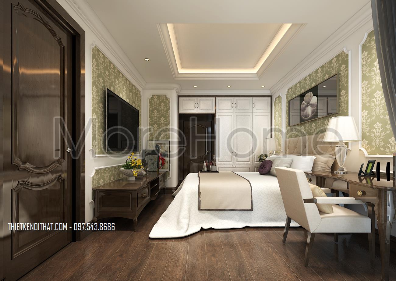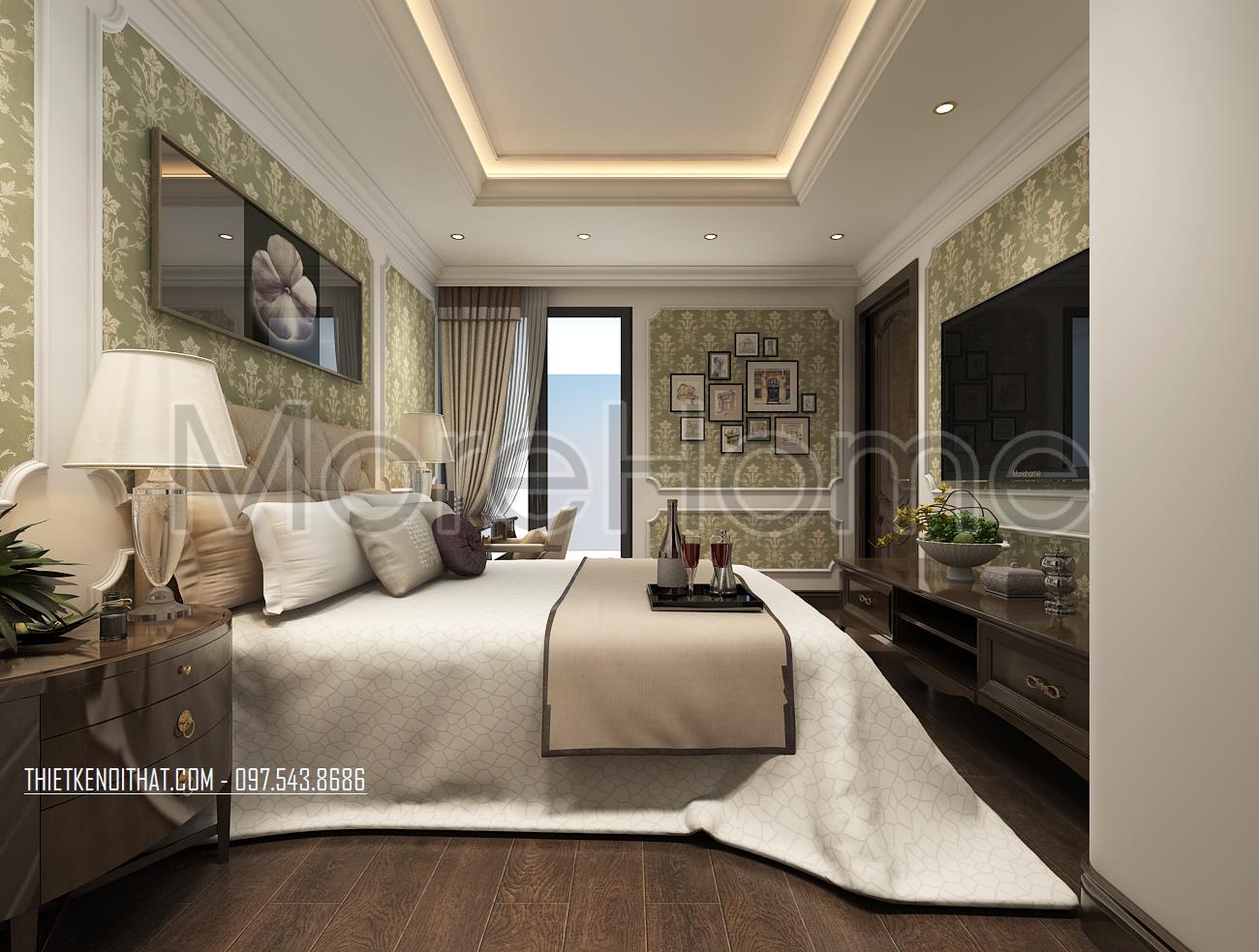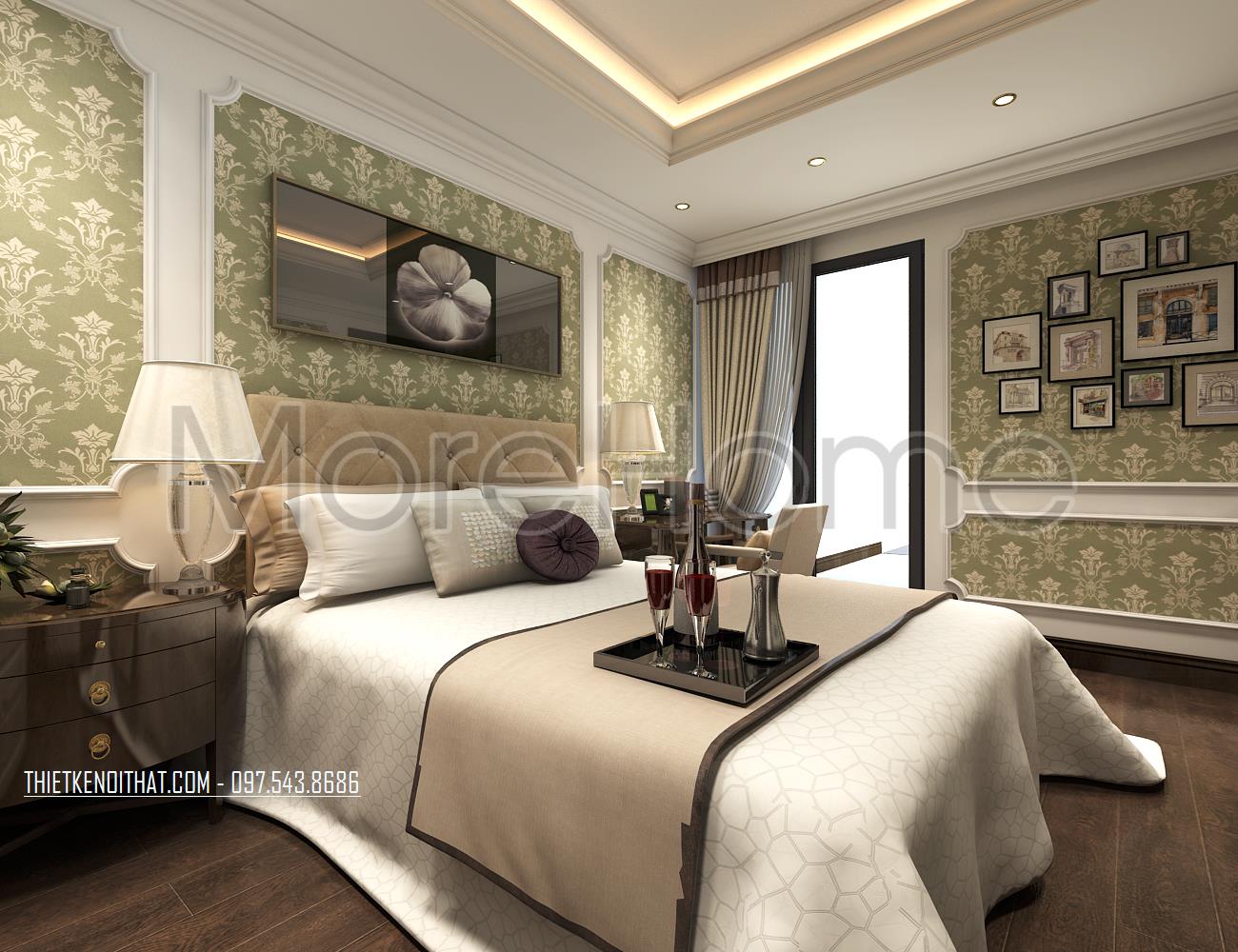 Khác với không gian phòng khách và phòng ăn ánh lên sự sang trọng thì trong thiết kế phòng ngủ chúng ta lại cảm nhận được sự thư thái, yên bình. Gam màu xanh của giấy gián tường giúp cân bằng, tạo điềm nhấn cho căn phòng màu trắng này kết hợp với nội thất gỗ không quá trở nền buồn tẻ. Thiết kế tủ quần áo đơn giản với tone màu nhẹ nhàng phối hợp hài hòa với các chi tiết thiết kế tạo sự đồng bộ và thống nhất cho căn phòng. Không gian phòng không quá rộng, tuy nhiên với thiết kế khung cửa với cửa kính cường lực đã tận dụng tối đa ánh sáng tự nhiên mang lại sức sống và tạo cảm giác cơi nới không gian.