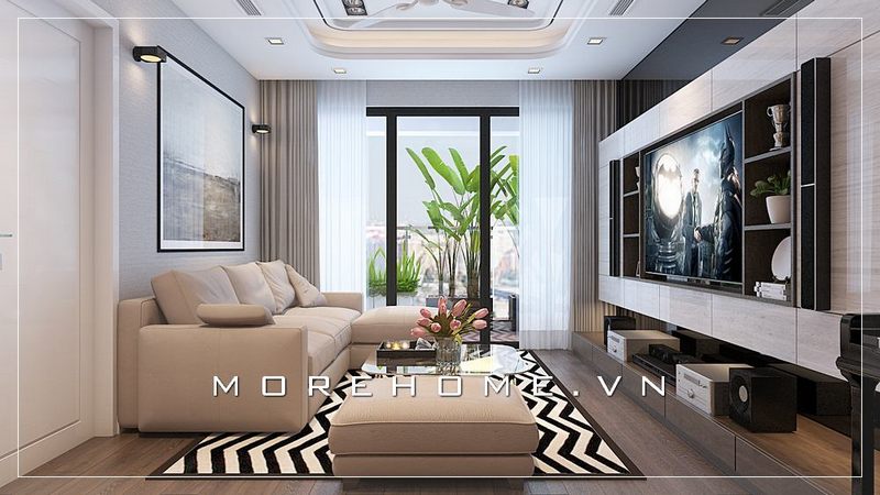 Đầy ấn tượng với màu kem nhẹ nhàng tinh tế của bộ sofa da dạng góc tối ưu không gian phòng khách căn hộ chung cư.