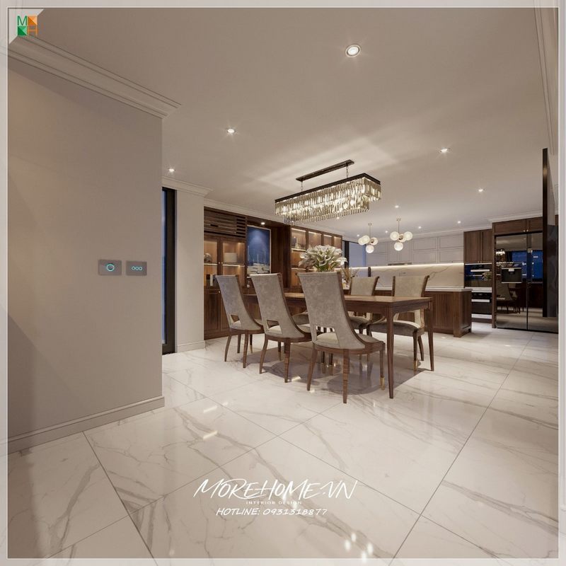 Phòng ăn nơi thưởng thức những món ăn sau một ngày làm việc cùng với người thân nên việc sắp xếp nội thất và bố trí để đem lại sự hợp lí tiện nghi nhất.